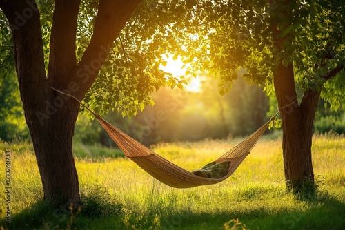 Serene afternoon in nature with empty hammock between trees in sunlit field
