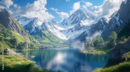 Serene alpine lake nestled in a valley, surrounded by snow-capped mountains under a bright blue sky.