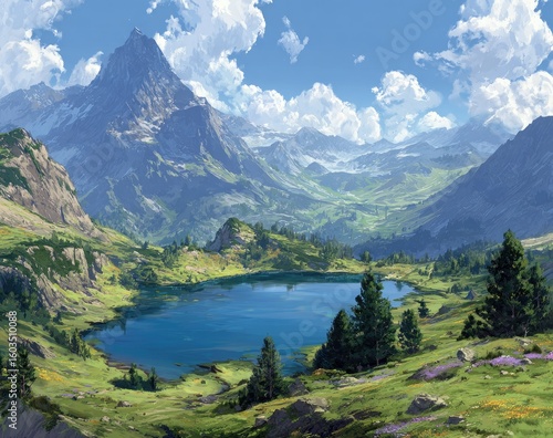 Serene alpine lake nestled in a verdant valley, surrounded by majestic mountains under a bright, partly cloudy sky