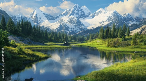 Serene Alpine Meadow with Winding River and Majestic Mountains