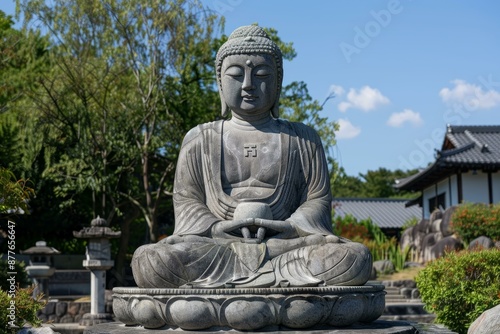 Serene ancient stone buddha statue meditating peacefully in a japanese garden
