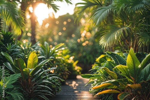 Serene and Lush Tropical Plants with Bokeh Effect in Bright Sunlight