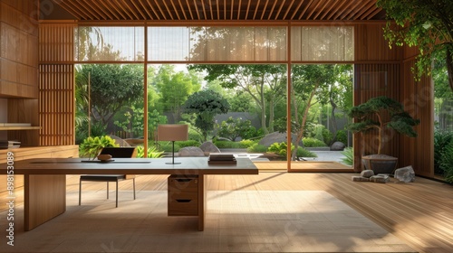 serene and minimalist Japanese-inspired office with clean lines, natural wood surfaces, and a Zen garden view
