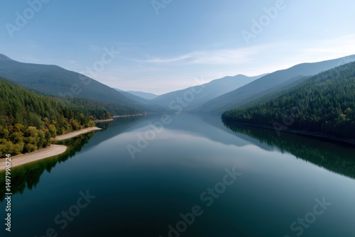 serene and minimalistic aerial view of crystal clear lake surrounded by lush greenery and distant mountains