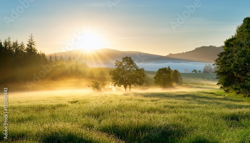 Serene and peaceful rural morning with soft mist gently rising above a dew-kissed meadow, illuminated by the first golden rays of the sun