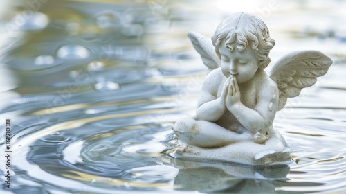 Serene angel statue praying on water. Peaceful image of a cherubic angel statue, hands clasped in prayer, resting on rippling water, perfect for spiritual or religious themes.
