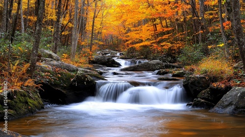 Serene autumn landscape featuring a flowing stream amidst vibrant orange foliage