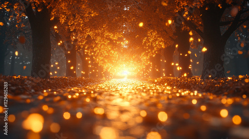 serene autumn park with a sunlit path surrounded by golden foliage. The warm glow and soft blur evoke tranquility, reflection, and the passage of time, symbolizing life's journey and transition