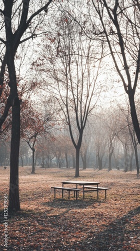 Serene Autumn Scene with Bare Trees and Empty Picnic Table in Park