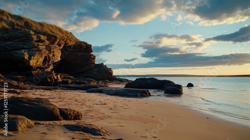Serene Beach at Sunset with Rock Formations and Soft Sand Under a Colorful Sky