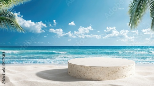 Serene Beach Scene with Smooth Stone Platform and Clear Blue Sky
