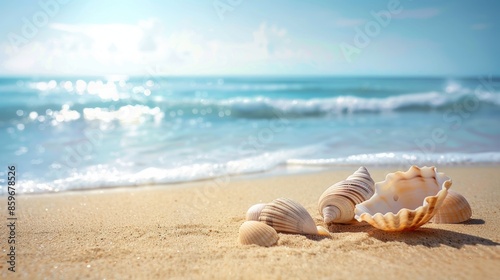Serene Beach with Seashells on White Sand and Turquoise Waves Under a Sunny Sky