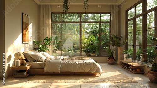 Serene bedroom with large windows and indoor plants - generative ai