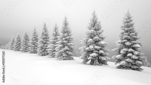 Serene Black and White Spruce Forest Covered in Fresh White Snow on a Foggy Winter Day