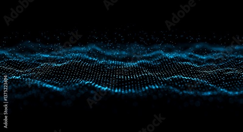 Serene blue digital ocean of shimmering particles flowing gently across a dark abyss, a calming abstract digital landscape.