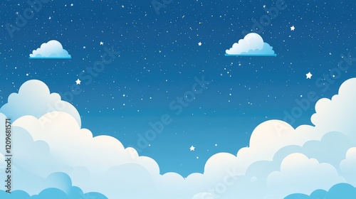 Serene Blue Sky with Fluffy White Clouds and Twinkling Stars at Dusk Over a Calm Horizon in a Tranquil Atmosphere