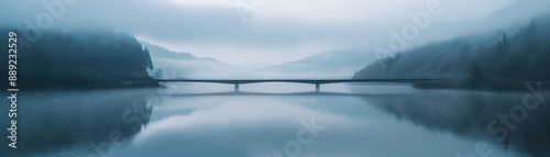 Serene bridge spanning across a misty lake with fog-shrouded trees and hills in the background. Peaceful and calming natural scenery.