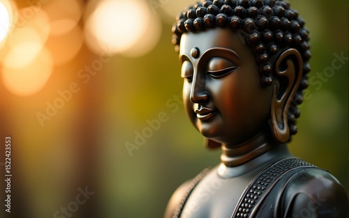 Serene Bronze Buddha Statue Close up with Warm Bokeh Lights. High quality