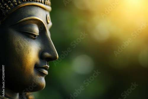 Serene buddha statue in golden sunlight with peaceful expression and green background