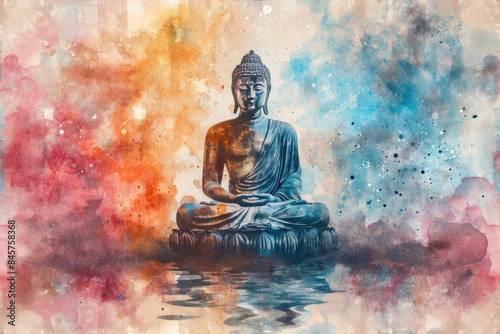 Serene Buddha Statue in Meditation with Vibrant Watercolor Background Reflecting in Water