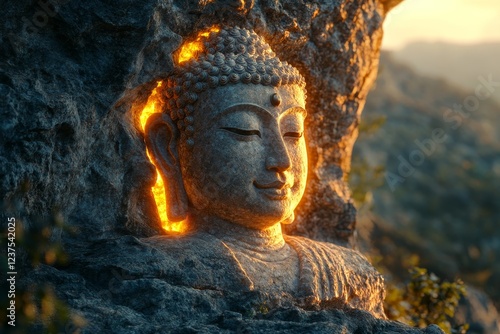 Serene Buddha statue in mountain cave, sunset glow