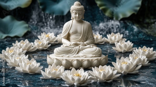 Serene Buddha Statue Surrounded by Lotus Flowers in Tranquil Setting