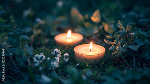 Serene Candlelight Amidst Lush Greenery in Peaceful Outdoor Evening Meditation Setup : Generative AI