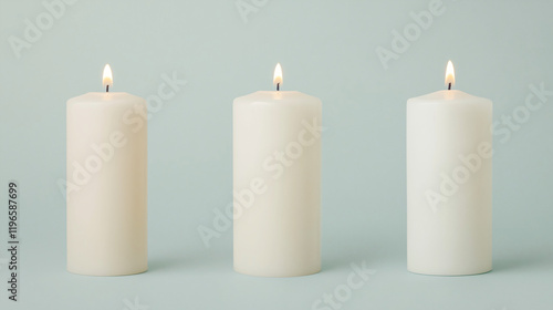 Serene Candlelight Trio: Three unlit ivory pillar candles arranged in a row against a soft blue-green backdrop. The candles are subtly different shades, creating a calming and elegant scene.