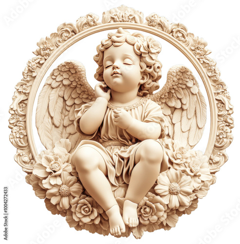 Serene Cherub in Ornate Frame: A charming cherubic angel, sculpted in serene repose amidst a floral wreath, rests within an elegant circular frame. This exquisite image evokes peace and tranquility.