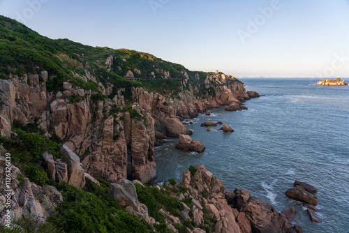 Serene Coastal Landscape with Rugged Cliffs and Calm Waters