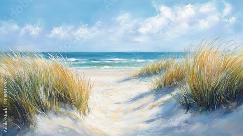 Serene Coastal Scene with Dunes and Lush Grass Under Blue Sky