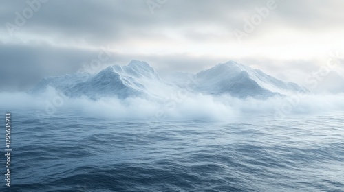 Serene Coastal Scene with Majestic Snow-Capped Mountains and Gentle Sea Waves Under a Misty Sky, Capturing Nature’s Tranquility and Beauty in a Perfect Moment