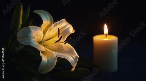 serene composition featuring a beautiful lily and a burning candle on a dark background, symbolizing remembrance and peace with space for text