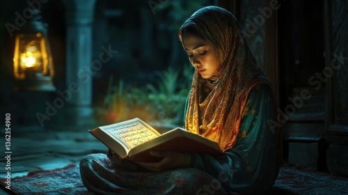 Serene contemplation, Young woman reads by lantern light in peaceful setting