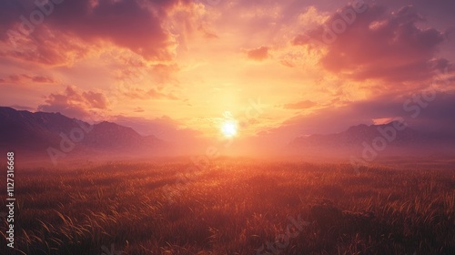Serene countryside sunset with vibrant skies and golden hour light illuminating the horizon and gently swaying grass in a tranquil landscape