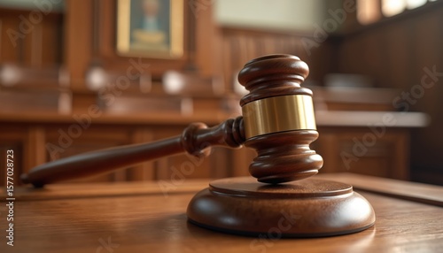 Serene courtroom scene with judge bench, wooden gavel, harmonious background of courtrooms, wooden panels. Gavel on bench in good condition, focus on wooden hammer. Courtroom setting, jurisprudence