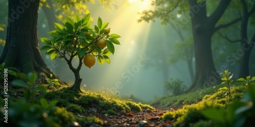 Serene Dawn A Lemon Tree in a Misty Forest Path