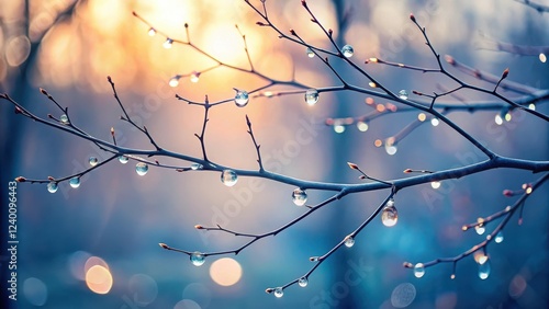 Serene Dewdrops Adorn a Branch at Dawn, Reflecting Soft Light and a Peaceful Atmosphere