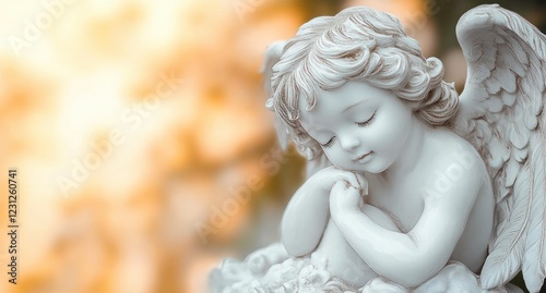 Serene Dreaming Angel Sculpture in Golden Sunlight Surrounded by Soft Clouds