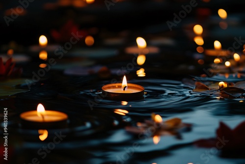 Serene evening scene with floating candles illuminating a calm water surface, creating a tranquil and romantic atmosphere.