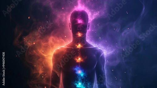 Serene figure meditating with vibrant chakras on cosmic background at twilight. Generative AI