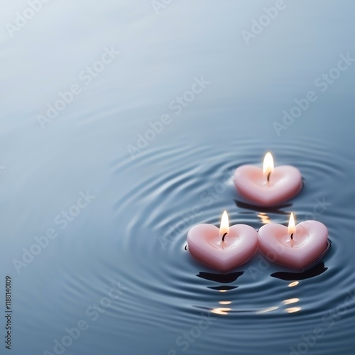 Serene floating heart candles on calm water, spa background, relaxation imagery