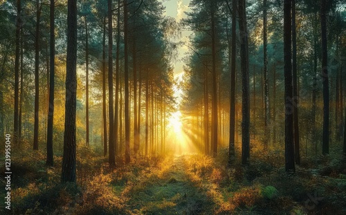 Serene Forest Dawn with Gentle Sunlight and Ethereal Light Rays