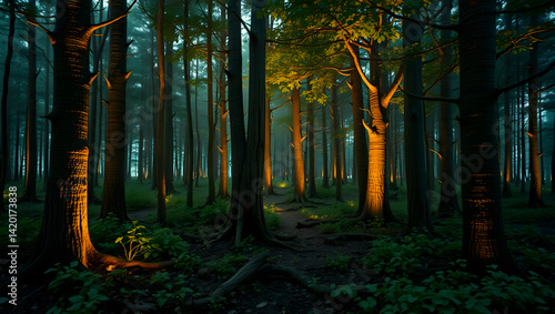 Serene Forest Ecosystem Glowing Trees and Mystical Path