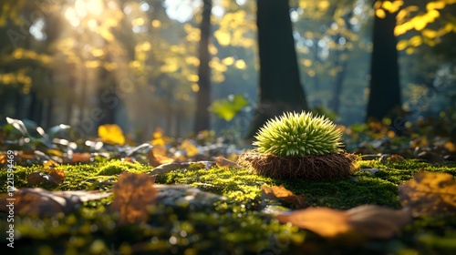 Serene Forest Environment with Sunlight Filtering Through Trees Highlighting Unique Green Plant on Mossy Ground in Autumn Season