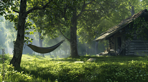 Serene Forest Glade with Hammock, Cabin, and Dappled Light Through Trees