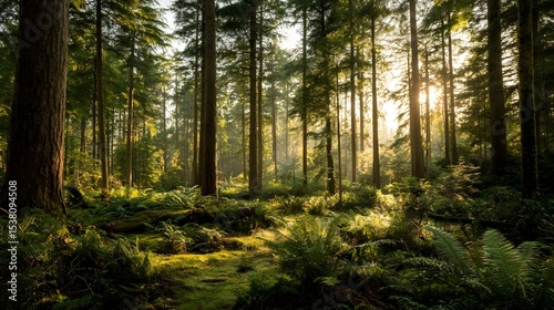Serene forest landscape at sunrise with tall trees, lush greenery, and soft light filtering through