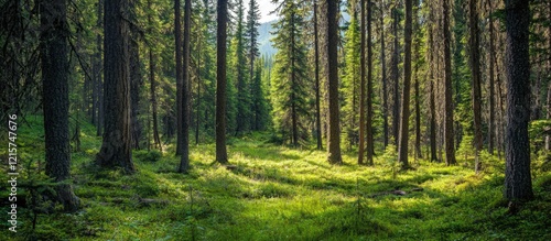 Serene forest landscape with towering fir trees and lush greenery providing ample copy space for text or marketing content