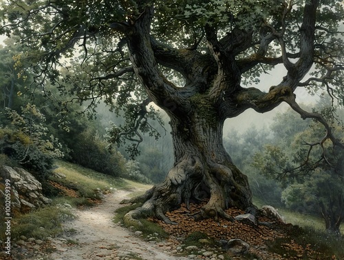 Serene Forest Path with Majestic Oak Tree - Nature Painting