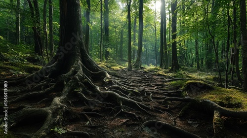 Serene Forest Pathway Among Ancient Trees and Vibrant Greenery